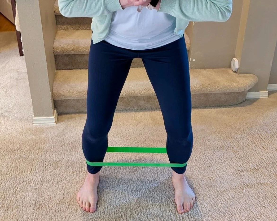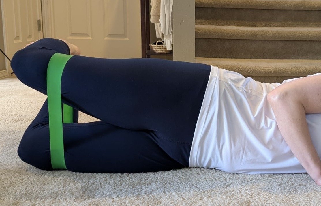 Lie on your side with your knees slightly bent and one leg stacked on top of the other. Place a resistance band around your thighs and keep your body in a straight line. Keeping your feet together, lift your top knee, hold for a few seconds, then lower it back to the starting position. Repeat for 1 minute, then switch sides. To make it harder, lift your feet off the ground while keeping them touching. Do 3 sets.