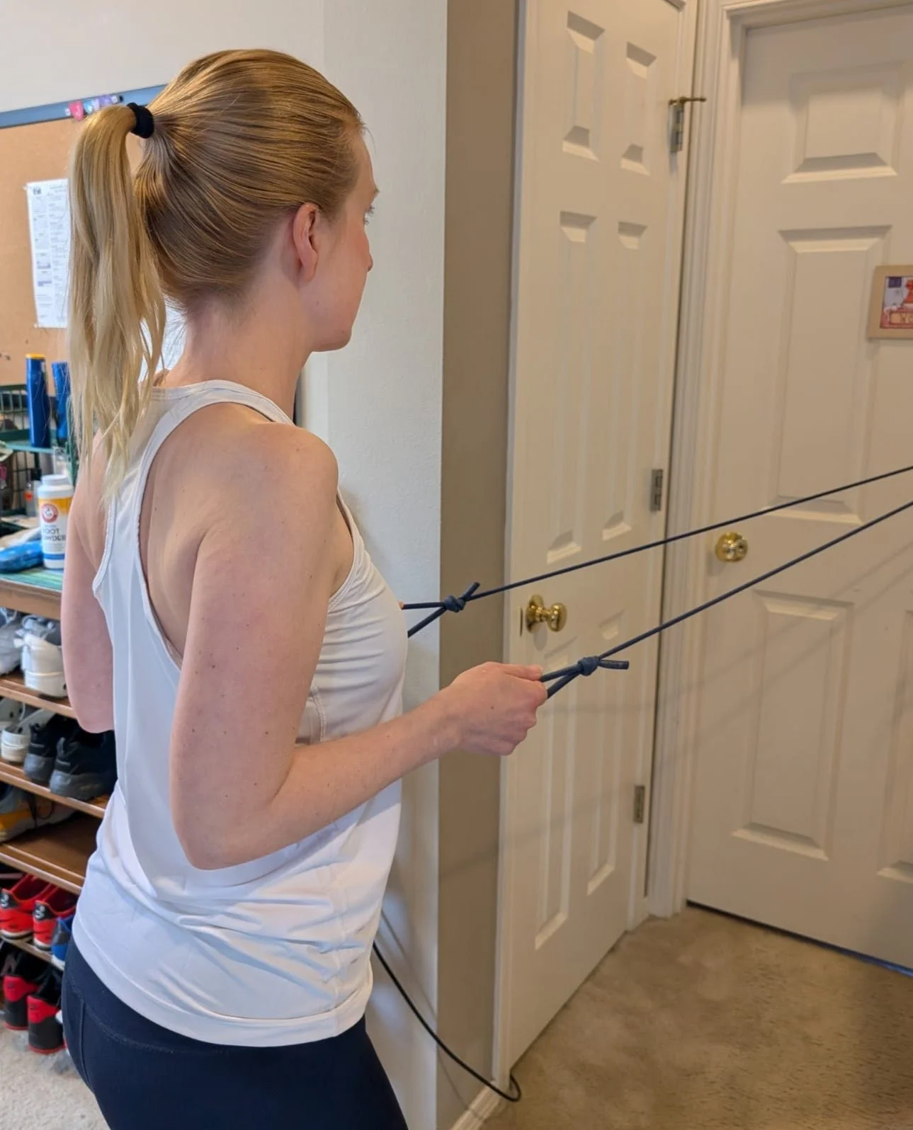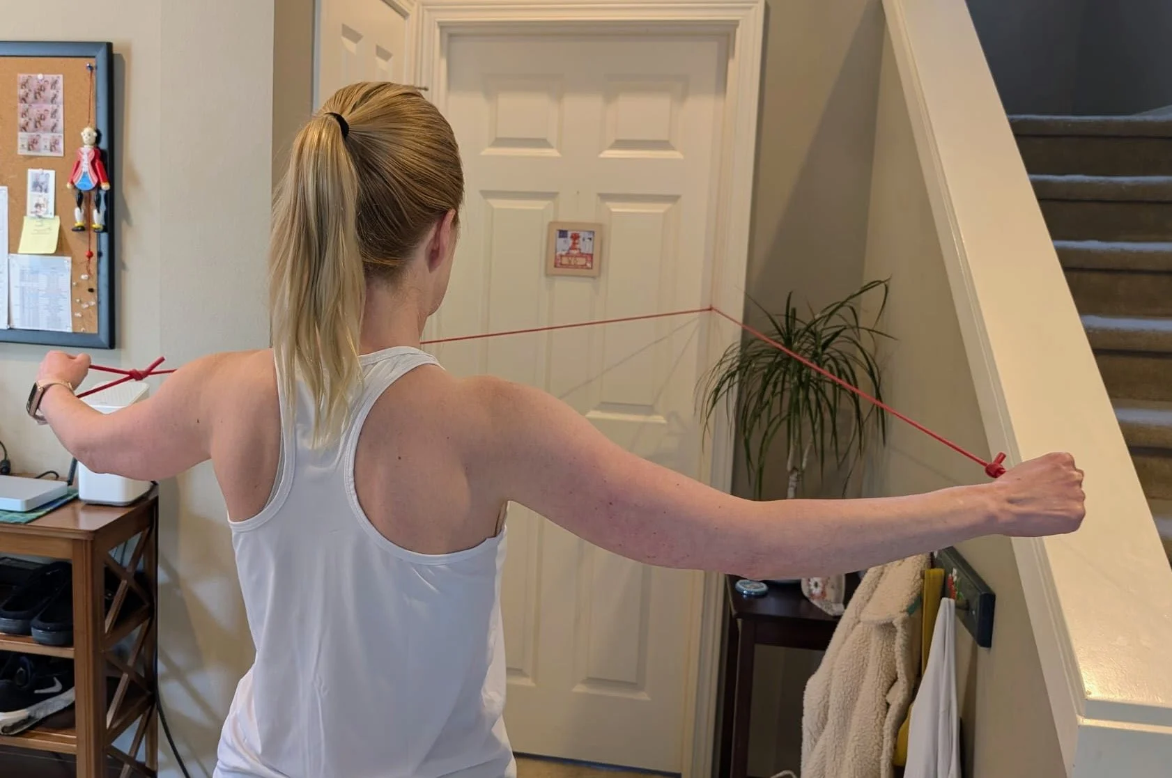 Attach a resistance band at chest height. Stand facing the anchor and hold the band with your arms extended in front of you. With a slight bend in your elbows, pull the band apart and squeeze your shoulder blades together for 5 seconds. Slowly return to the starting position, hold for 5 seconds, and repeat 5 times.
