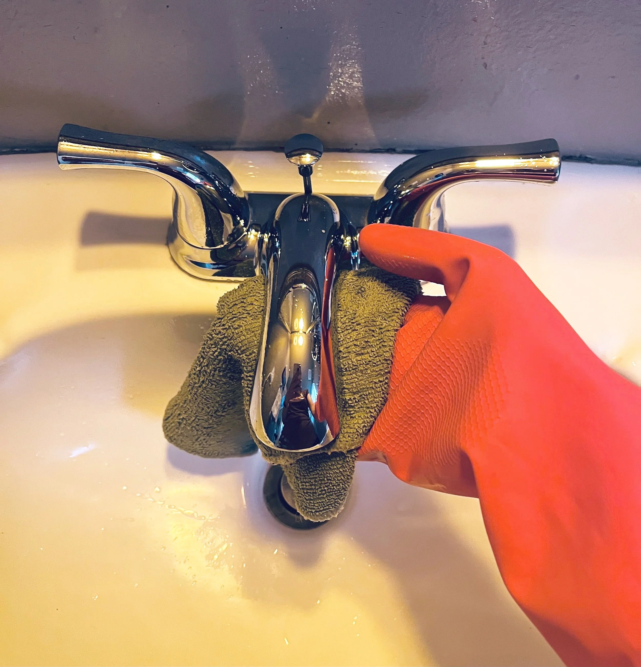This includes wiping all the kitchen counters, the sink, fridge, oven, stove, oven fan, microwave, cabinet doors — everything. I make a paste with baking soda and water for the sink, and scrub it clean with vinegar and a brush to get all the grime off.