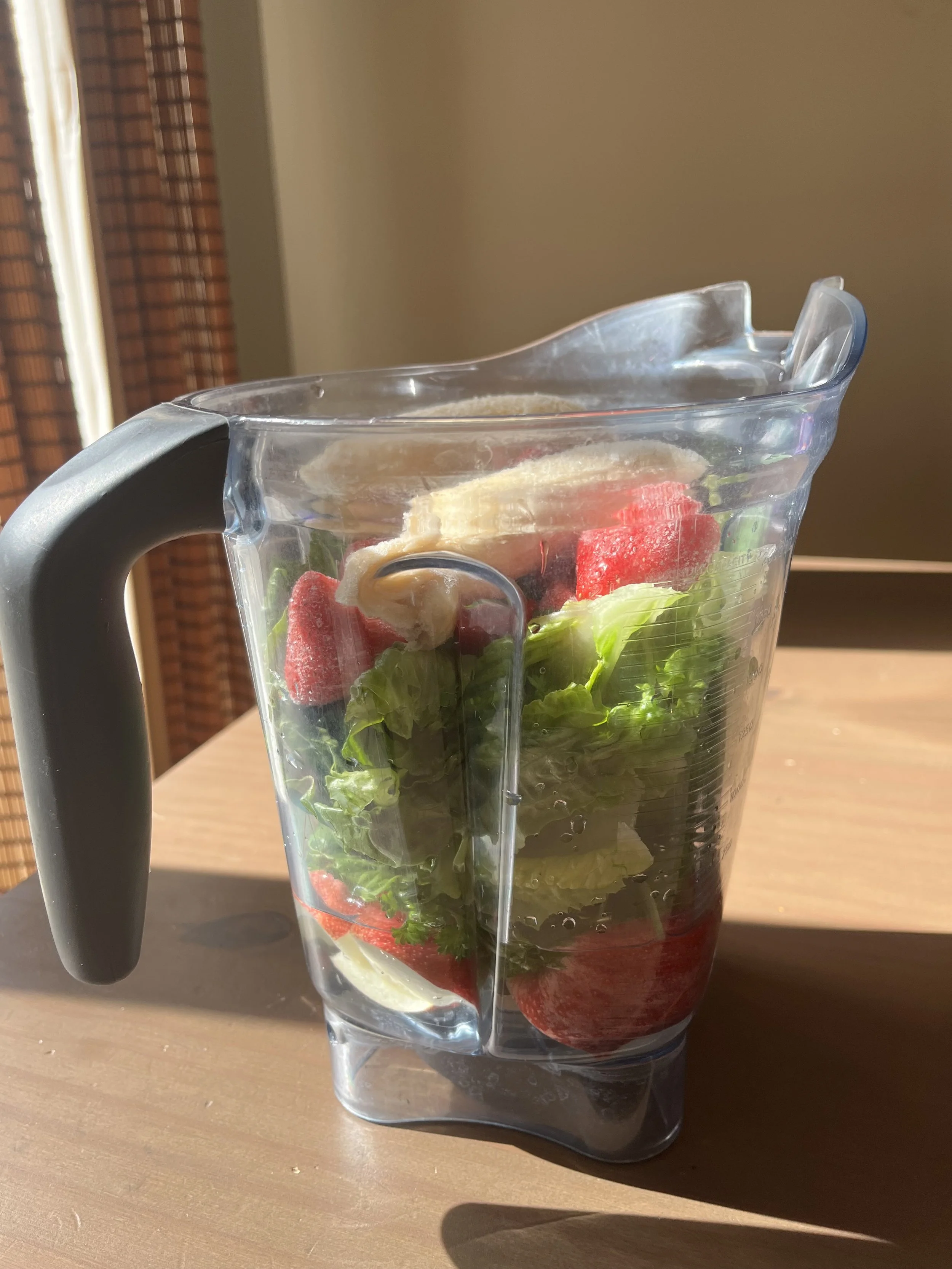 I use a Vitamix to blend everything, as it makes the mixture very smooth in less than a minute. The water goes in first, followed by the unfrozen fruits, then the greens, and finally the frozen fruits.