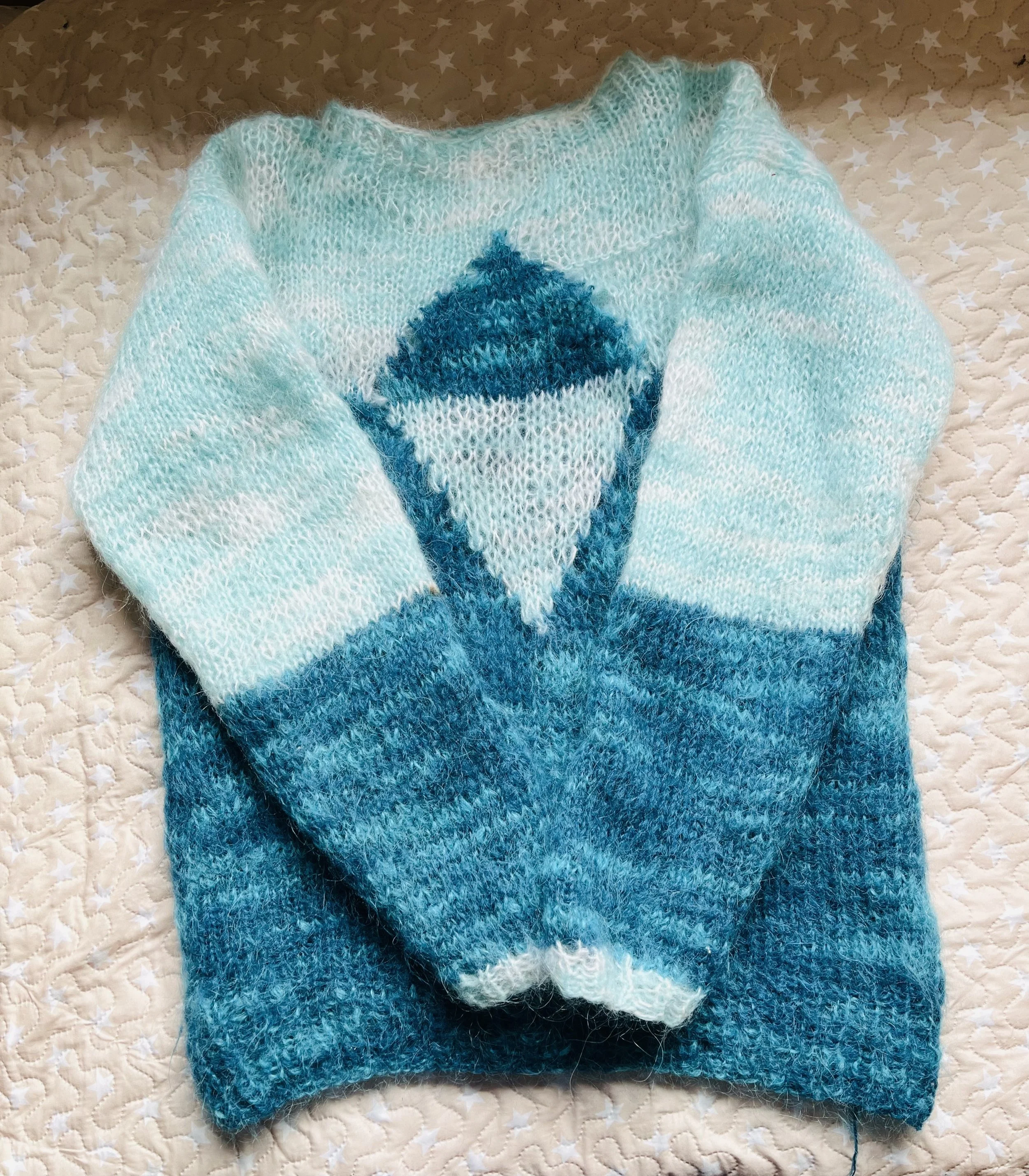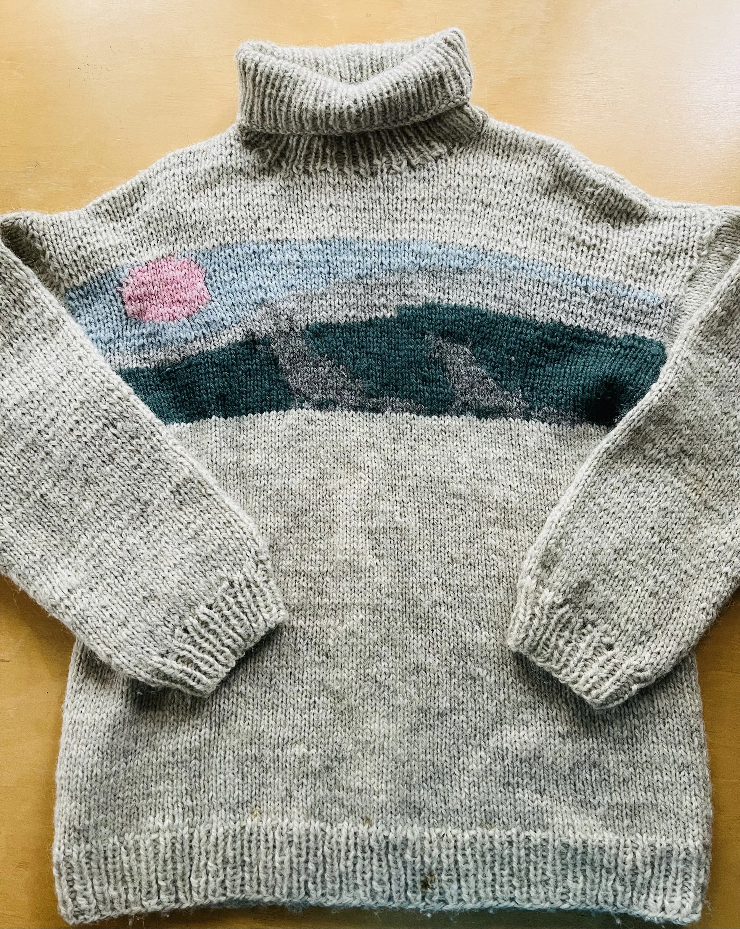 Lopulta halusin haastaa itseäni enemmän, joten seuraavaan villapuserooni suunnittelin itse kuvion. Olin juuri lukenut Jack Londonin Erämaan kutsun ja innostunut susista. Niinpä otin ruutupaperia ja piirsin kuvan, jossa sudet ulvoivat kuuta kohti. Tuo villapaita oli tehty hieman parempilaatuisesta langasta Novitan Seitsemällä veljeksellä, ja muistaakseni sain sen valmiiksi yläasteella ollessani.