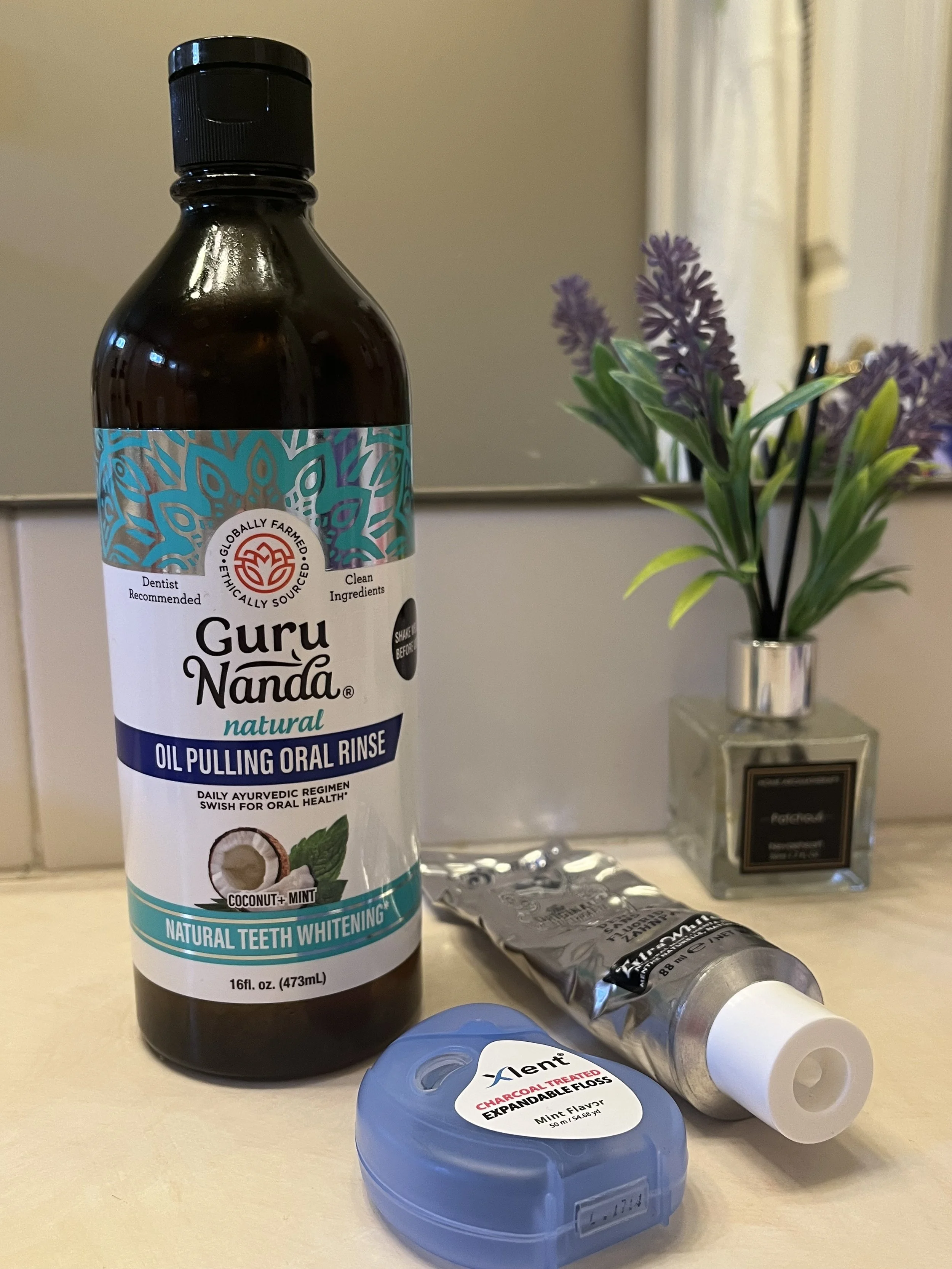 Kuuntelin vähän aikaa sitten podcastia, jossa Nadine Artemis puhui luonnollisesta suunhoidosta ja öljypurskuttelusta. Toisessa episodissa Dr. Guru Nanda selitti, miten öljypurskuttelu toimii ja miksi se on vielä tänäkin päivänä ajankohtaista. Kokeilun haluni heräsi taas ja tilasin Guru Nandan öljypurskuttelusuuveden. Pidin siitä paljon enemmän kuin pelkästä kookosöljystä, jota olin aiemmin kokeillut. Lisätyt yrtit ja raikas mintun maku tekivät kokemuksesta huomattavasti miellyttävämmän.